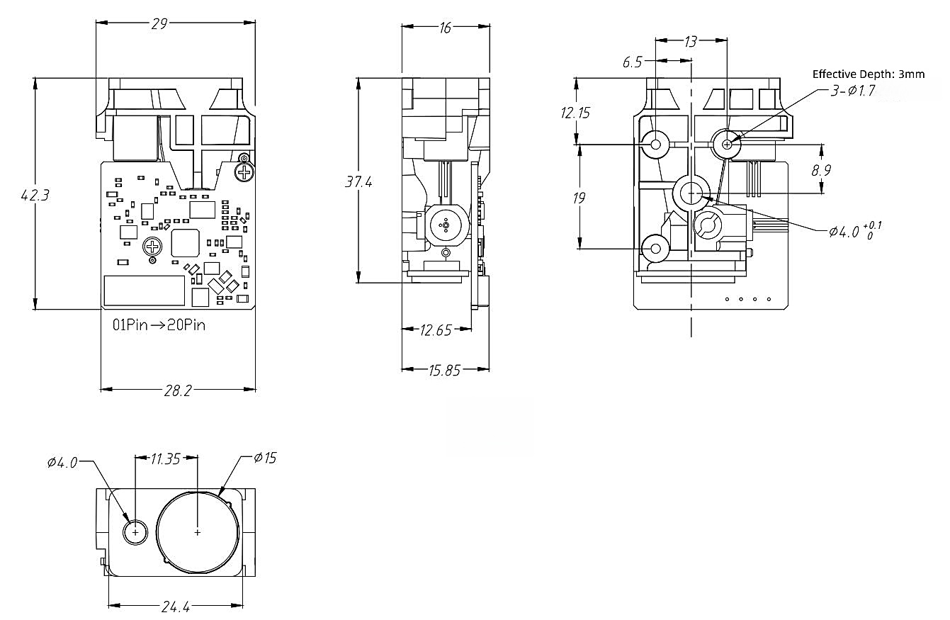 Ideal for industrial & commercial needs, the 26 Movement is a compact (42.3×29×16mm) red-light dual-emission laser ranging module. It delivers 150m measurement range (front-end reference), ±3mm±100×10⁻⁶×D room-temperature accuracy (Kodak whiteboard, <500lux), and meets Class 2 laser safety standards—reliable for long-term use.