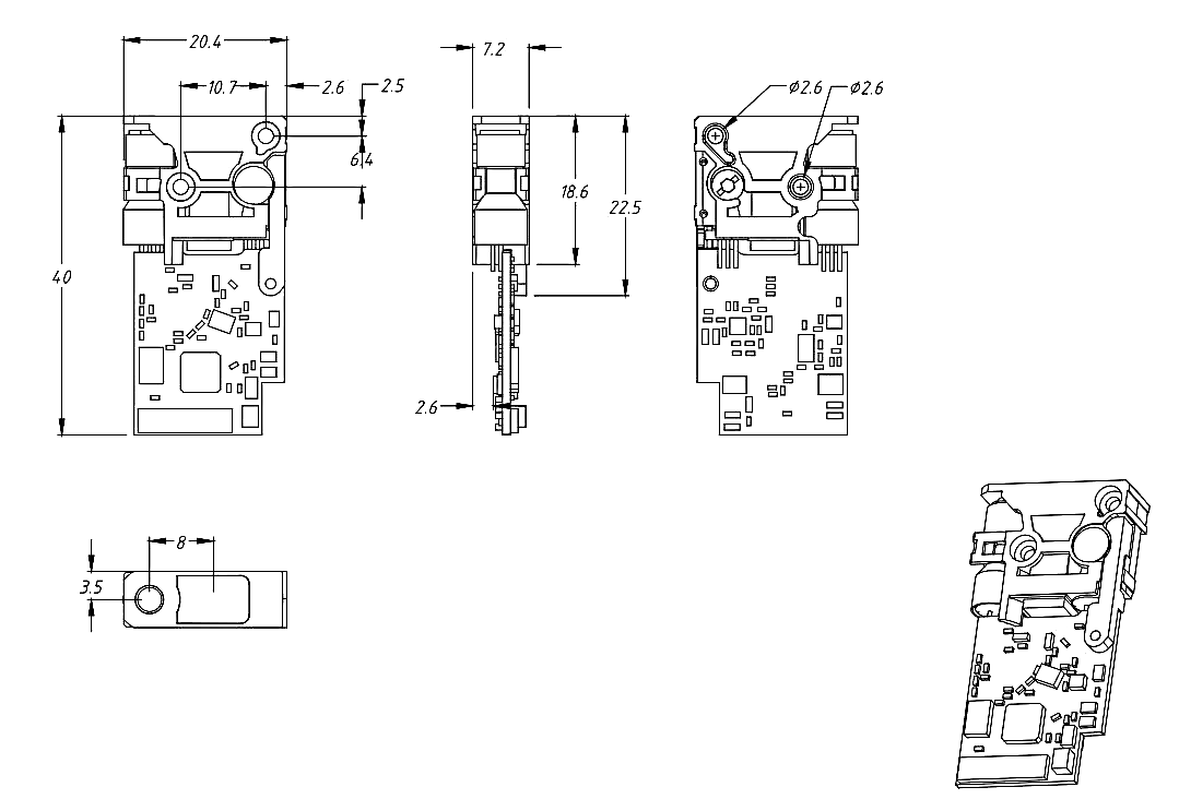 Offering red (650nm±20nm, 0.5-1.5mW) or green (0.5-4.5mW) laser (customizable), it’s ultra-compact (40×20.4×7.2mm) with low power consumption (<70mA standby, <200mA peak @3.3V). Complies with Class2 safety standards, operating at 0~40℃.