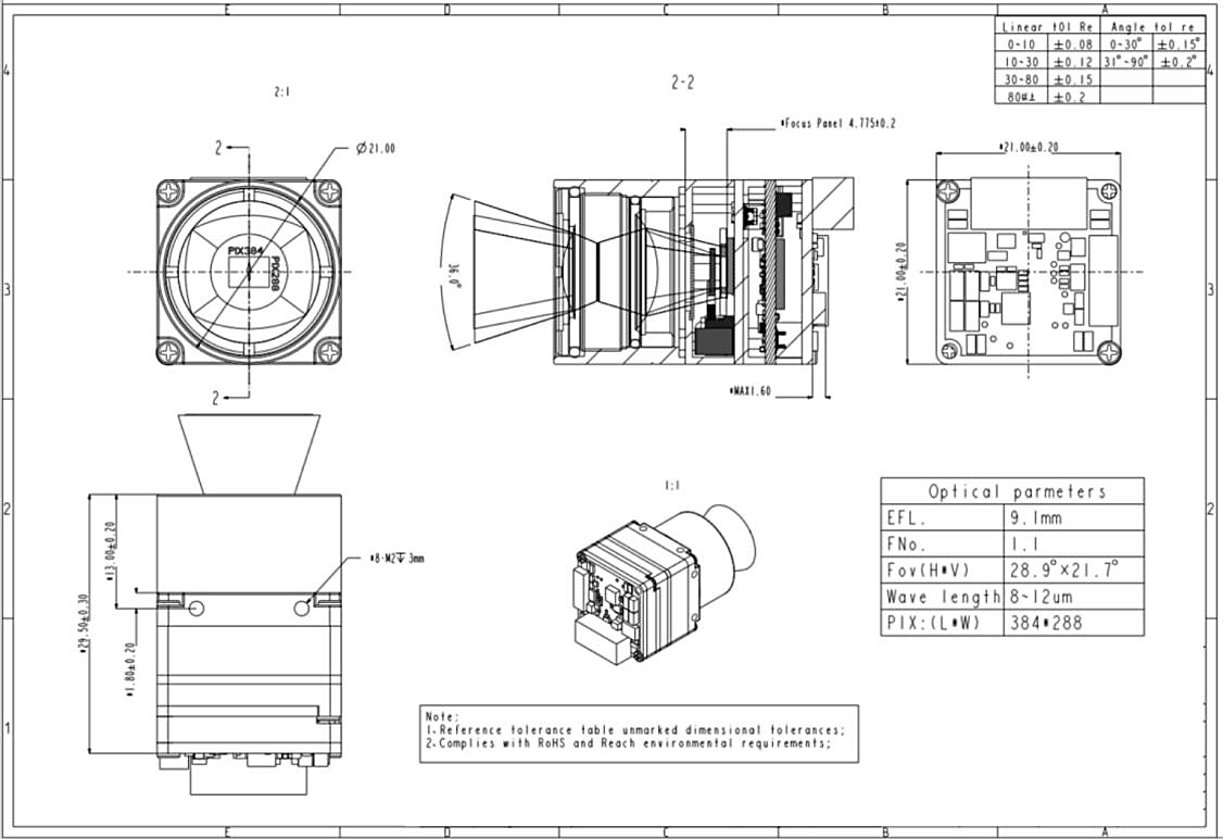 | 15mm/ Manual Zoom | 11.7°×8.8° (256×192) | 15mm | 1 | 0.8 mrad | 4.7m~∞ | 1.7km | 0.42km | 0.21km | 20.48g±5% |