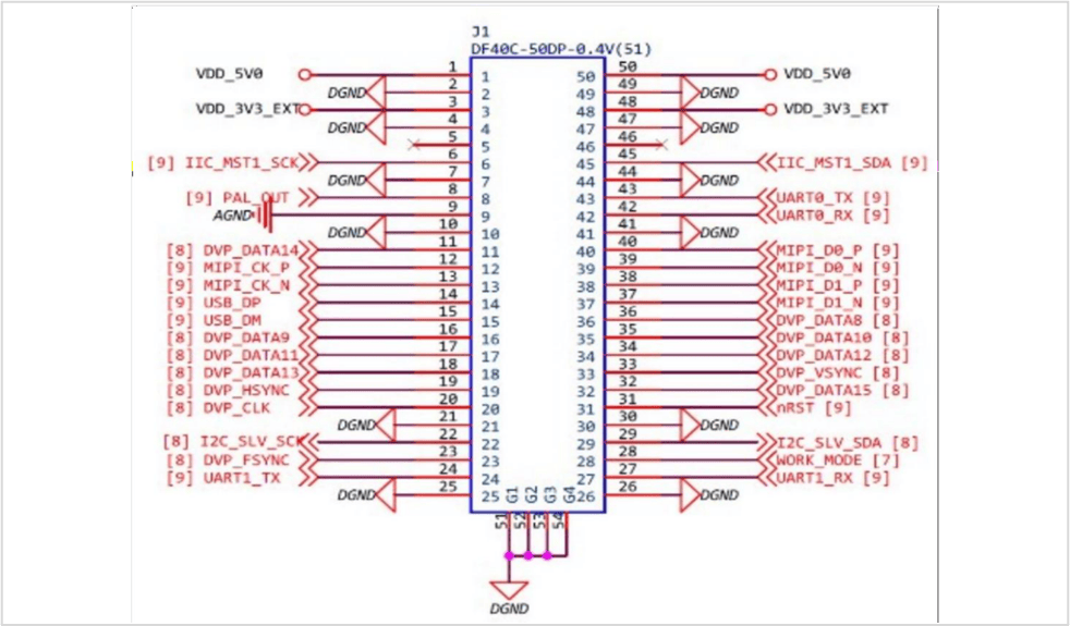 | 20, 33, 19, 32, 11, 18, 34, 17, 35, 16, 36 | DVP_CLK, DVP_VSYNC, DVP_HSYNC, DVP_DATA15~8 | Output | DVP data signal DATA15:MSB DATA8:LSB |